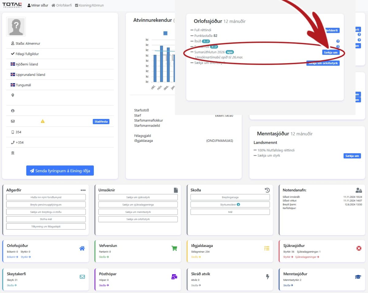 Til að sækja um er smellt á bláa takkann Sækja um við Sumarúthlutun Einingar-Iðju 2026 í orlofsrammanum á persónublaðinu.