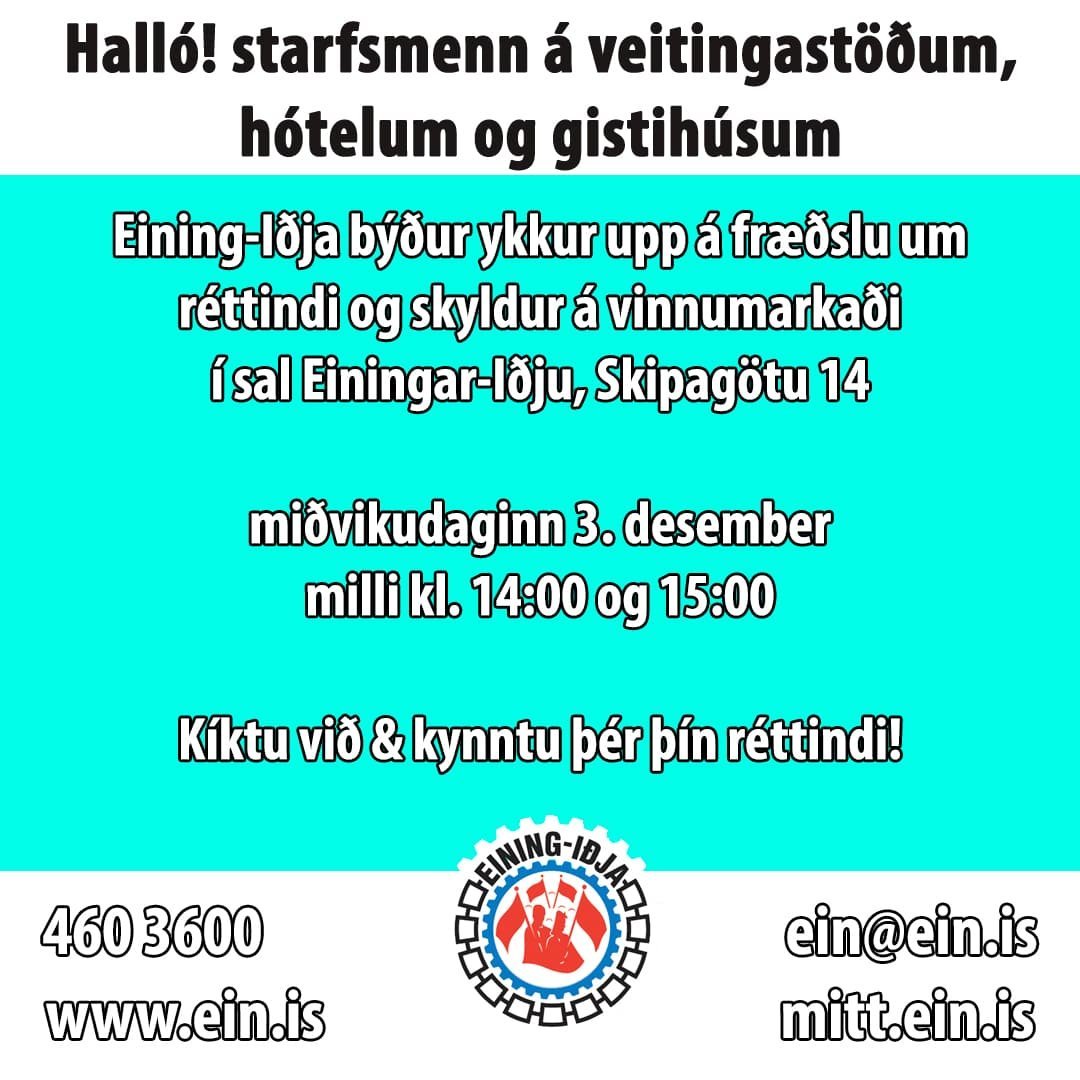 Eining-Iðja býður félagsmönnum sem starfa á veitingastöðum, hótelum, gistihúsum eða annarri ferðaþjónustu á kynningu um réttindi og skyldur á vinnumarkaði.