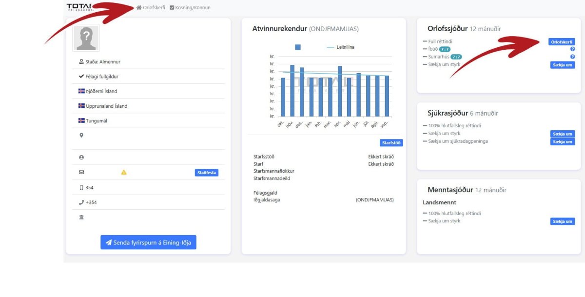 Til að komast inn á bókunarsíðuna, er smellt á takkann Orlofskerfi sem finna má efst til vinstri á Mínum síðum eða bláa takkann við Full réttindi í orlofsrammanum á persónublaðinu.