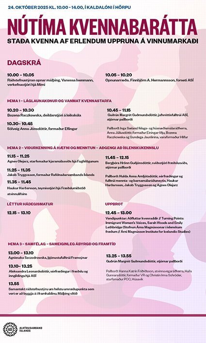 Í dag, á kvennafrídaginn 24. október 2025, milli kl. 10:00 og 14:00 ætlar Alþýðusambandið að halda málþing um konur af erlendum uppruna á íslenskum vinnumarkaði, en viðburðurinn er haldinn í tilefni Kvennaárs 2025. Málþingið verður haldið í Kaldalóni í Hörpu. Fyrir þau sem ekki komast á staðinn verður hægt að fylgjast með málþinginu í streymi. Hlekkurinn á streymið